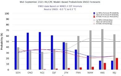 Em relação às temperaturas das águas do Oceano Pacífico Equatorial, região onde é configurado o El-Niño Oscilação Sul, as projeções matemáticas indicam um cenário do resfriamento dessas águas, o que pode então configurar uma nova La-Niña, mas de fraca intensidade. Segundo a projeção de consenso do IRI, existem 66% de chances da configuração de uma La-Niña no trimestre de Outubro, Novembro e Dezembro, e apenas 33% chances de permanência da situação de neutralidade. E vale ressaltar que, durante esta primavera de 2021, não existe a possibilidade da configuração de um El-Niño.
